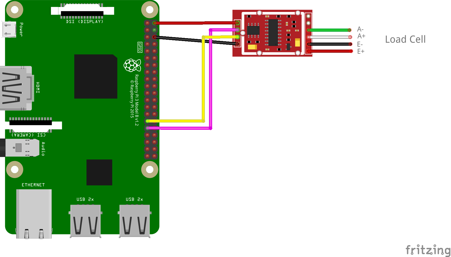 Si la construction est terminée, nous pouvons nous rendre au HX711. Les quatre câbles de la cellule de charge doivent être connectés au capteur de poids. Le HX711 vert, cependant, a six connexions, dont nous n’avons besoin que de quatre pour les câbles. La connexion est la suivante :