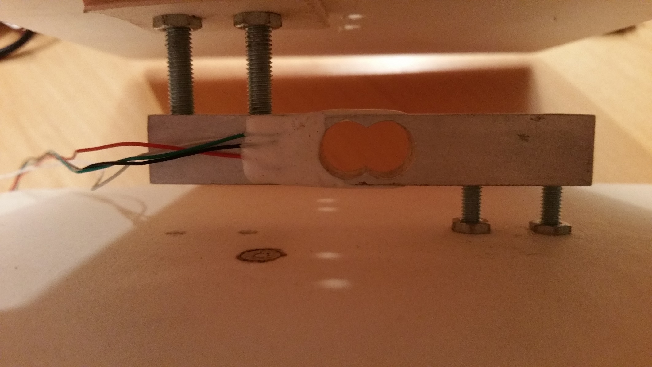 Avant que la cellule de charge ne soit connectée au capteur de poids HX711, elle doit être montée sur les deux plaques. Pour cela, j’ai fait des marquages au stylo à bille sur les planches de bois, là où les vis entrent en jeu. Avec une perceuse, j’ai percé les trous et inséré les vis. Entre la vis et le capteur de poids, il devrait y avoir un écrou, qui sert de protection à la planche (voir photos).